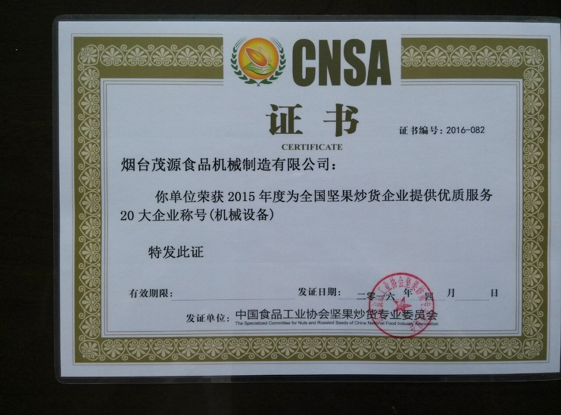展會(huì)期間,主辦單位還舉辦了全國(guó)堅(jiān)果炒貨行業(yè)國(guó)內(nèi)外新設(shè)備(包裝)、新技術(shù)、新型添加劑、配料等新產(chǎn)品推廣發(fā)布會(huì),發(fā)布了2015-2016年全國(guó)堅(jiān)果炒貨行業(yè)新設(shè)備和新型添加劑的使用分析和預(yù)測(cè)報(bào)告,還有9家中外企業(yè)的11項(xiàng)新設(shè)備(包裝)、新技術(shù)、新型添加劑進(jìn)行了推介發(fā)布。煙臺(tái)茂源食品機(jī)械制造有限公司作為9家中外企業(yè)之一在這次大會(huì)上了做了新設(shè)備的推介發(fā)布,并和現(xiàn)場(chǎng)業(yè)內(nèi)同行進(jìn)行提問(wèn)互動(dòng)。會(huì)后,舉辦了2015年度全國(guó)堅(jiān)果行業(yè)優(yōu)秀企業(yè)的頒獎(jiǎng)典禮,煙臺(tái)茂源等20個(gè)企業(yè)被評(píng)為2015年度為全國(guó)堅(jiān)果炒貨企業(yè)提供優(yōu)良服務(wù)企業(yè)稱號(hào)。