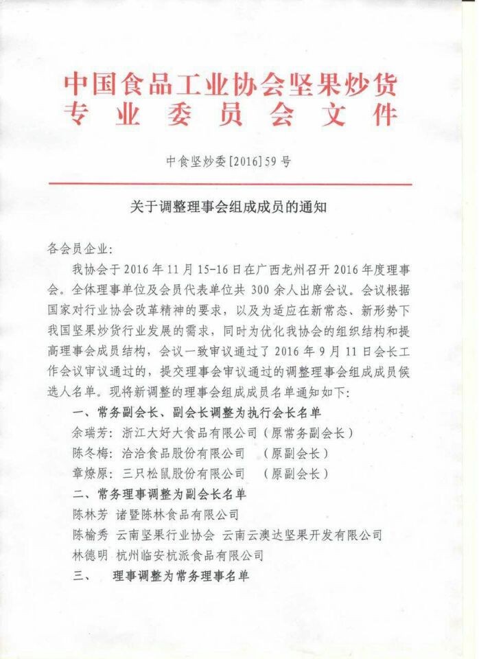 2016年11月15-16日,中國堅果協會年度理事會召開,中國堅果炒貨行業新的核心團隊誕生,全行業持續健康發展。我司總經理姜念波當選新一屆理事會常務理事。