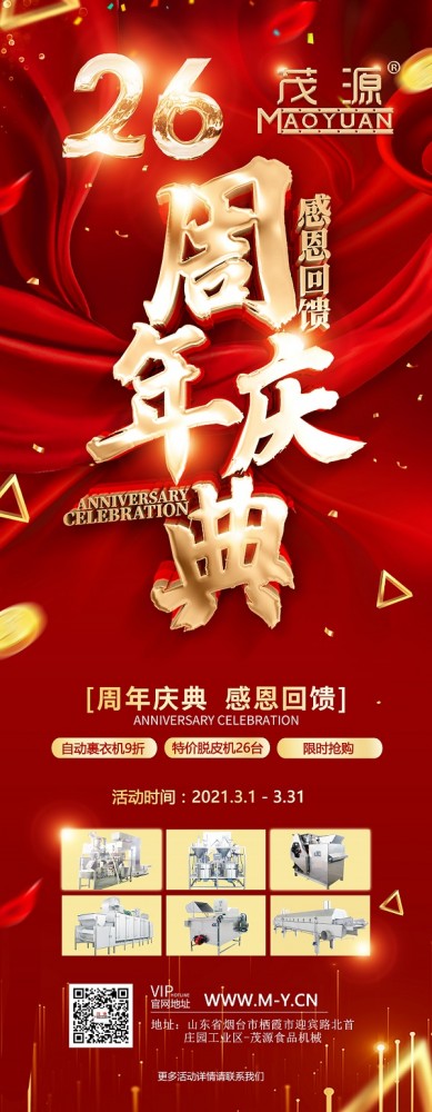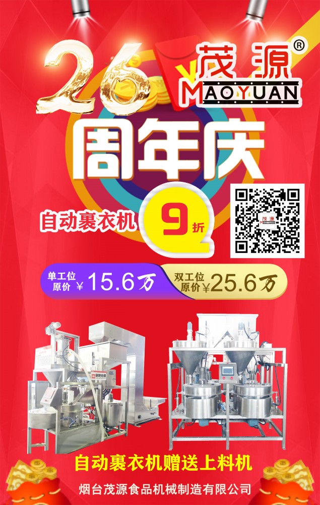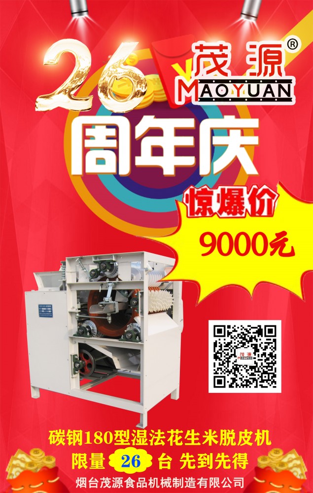 煙臺茂源食品機械即將迎來26周年慶,為感謝新老客戶長期以來的支持與信任,現特推出以下感恩回饋活動:單工位、雙工位自動裹衣機原價15.6萬元、25.6萬元基礎上降價10%,并隨機贈上料機;碳鋼180型濕法花生米脫皮機特價9000元,限量26臺,先到先得!
